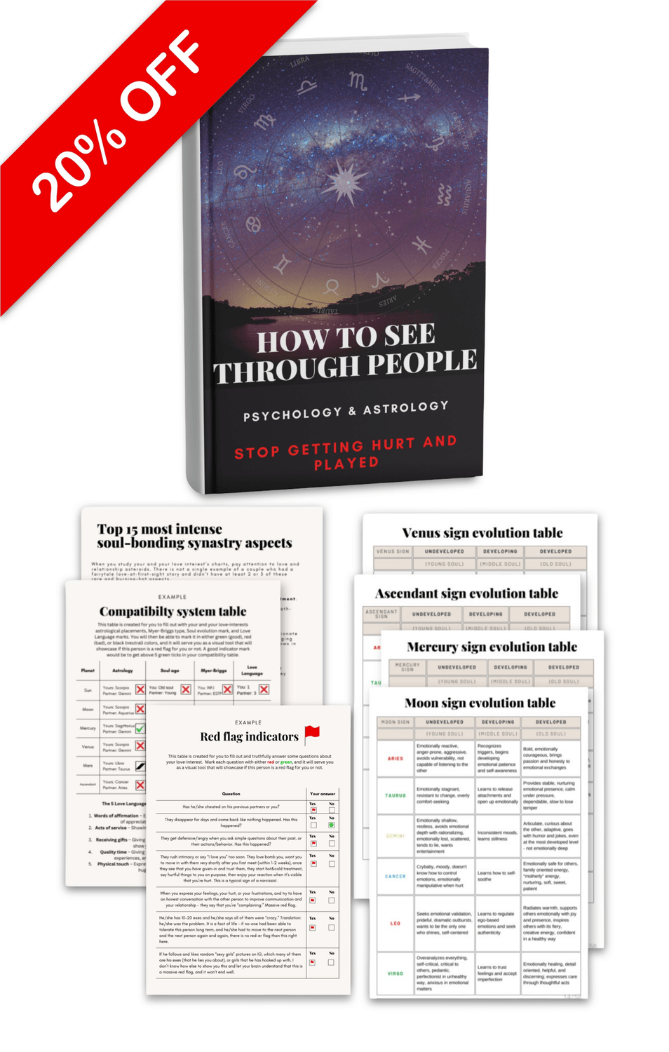 The eBook contains Soul age evolution tables for Big 6 placements (Sun, Moon, Venus, Mars, Mercury, Ascendant) - how a young soul, middle soul, and an old soul carry astrological energies differently. The tables showcase how, for example, a young soul Aries Mars carries a different energy than an old soul Aries Mars. This study and knowledge is extremely crucial in relationships and couples therapy.